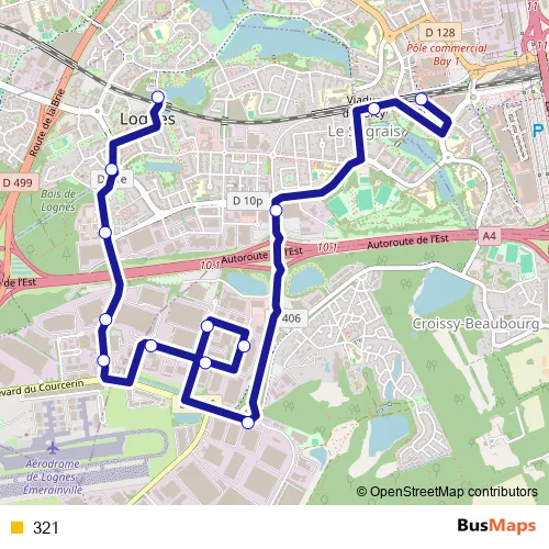 The first stop of the 321 bus route is Gare de Lognes and the last stop is Gare de Torcy. 321 is operational during everyday.