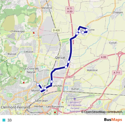 See why over 2 million users trust and consider busmaps.com as the best public transport website. busmaps gives you Clermont-Ferrand Buses suggested routes, real-time bus tracker, line route maps in Clermont-Ferrand, and helps to find the closest 33 bus stops near you. No internet available? Download an offline PDF map and bus schedule for the 33 bus to take on your trip.