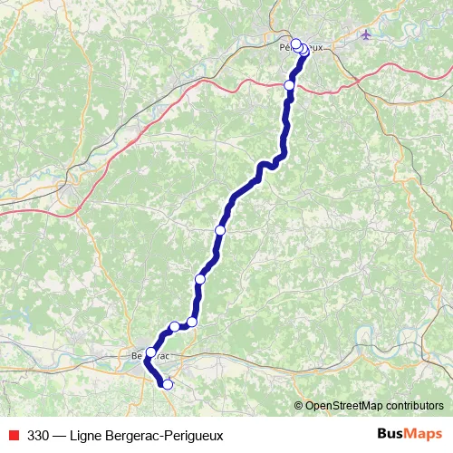 The first stop of the 330 bus route is LR Bergerac-Aérop Roumanière TAD (2) and the last stop is LR Perigueux-Gare Sncf(1). 330 (Ligne Bergerac-Perigueux) is operational during everyday.