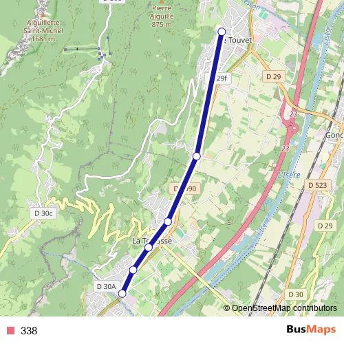The first stop of the 338 bus route is Le Touvet, Collège Pierre Aiguille and the last stop is La Terrasse, Le Carré. 338 is operational during on weekdays.