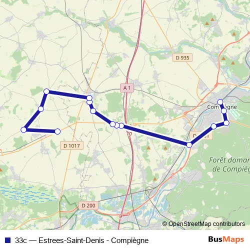 The first stop of the 33c bus route is Centre and the last stop is Gare Sncf. 33c (Estrees-Saint-Denis - Compiègne) is operational during everyday.