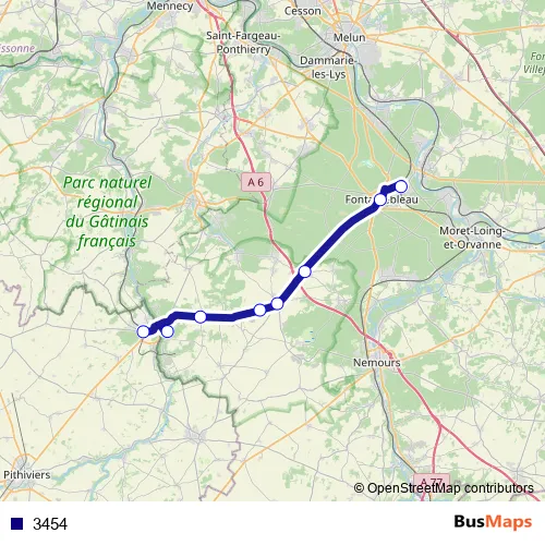 The first stop of the 3454 bus route is Gare de Fontainebleau, Avon (Quai 7) and the last stop is Gare de Malesherbes. 3454 is operational during everyday.
