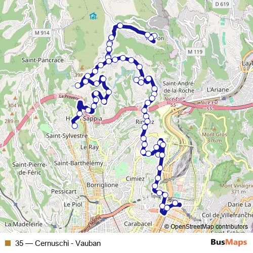 See why over 2 million users trust and consider busmaps.com as the best public transport website. busmaps gives you Nice Buses suggested routes, real-time bus tracker, line route maps in Nice, and helps to find the closest 35 bus stops near you. No internet available? Download an offline PDF map and bus schedule for the 35 bus to take on your trip.