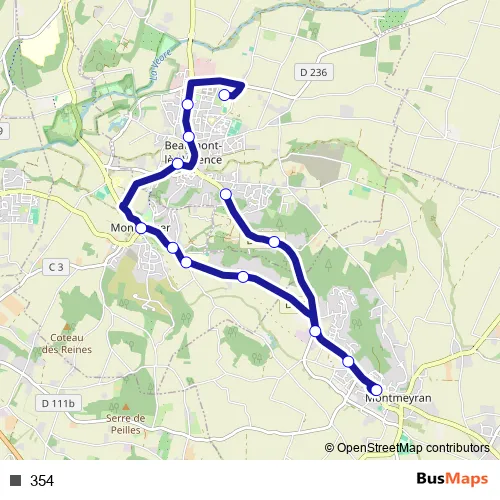 The first stop of the 354 bus route is Coll Marcelle Rivier and the last stop is LES Mottes. 354 is operational during on weekdays.