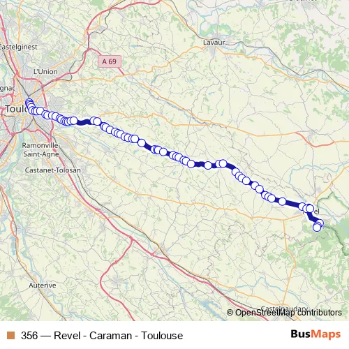 The first stop of the 356 bus route is Toulouse - Gare Routière and the last stop is Revel - Claude Nougaro. 356 (Revel - Caraman - Toulouse) is operational during everyday.