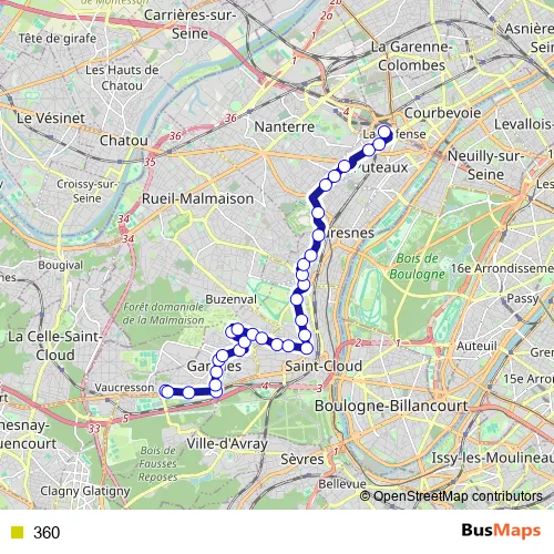 The first stop of the 360 bus route is Hôpital de Garches and the last stop is La Défense (voie Perronet Sud). 360 is operational during everyday.