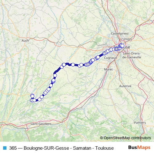 The first stop of the 365 bus route is Boulogne-SUR-Gesse - Collège and the last stop is Toulouse - Gare Routière. 365 (Boulogne-SUR-Gesse - Samatan - Toulouse) is operational during everyday.