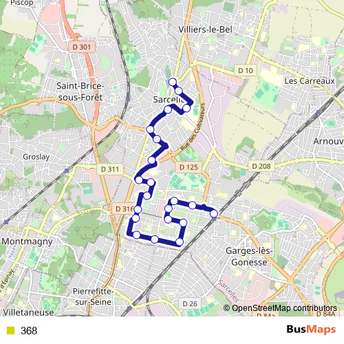 The first stop of the 368 bus route is Garges - Sarcelles Rer and the last stop is Place du Souvenir Français. 368 is operational during everyday.