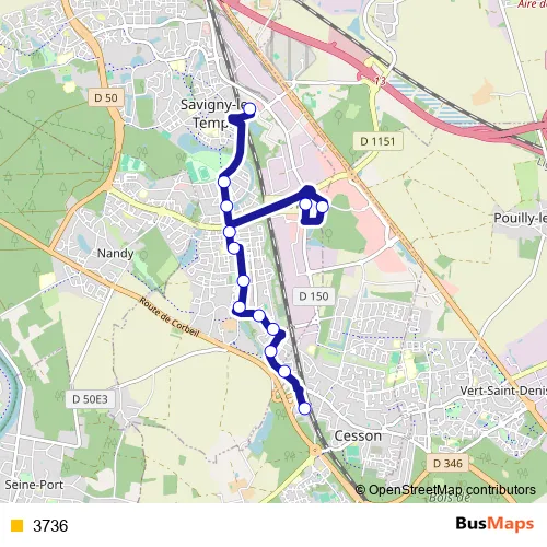 The first stop of the 3736 bus route is Cesson Gare and the last stop is Gare de Savigny - Nandy. 3736 is operational during everyday.