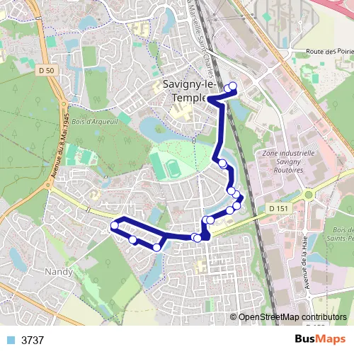 The first stop of the 3737 bus route is Gare de Savigny - Nandy and the last stop is Gare de Savigny - Nandy. 3737 is operational during everyday.