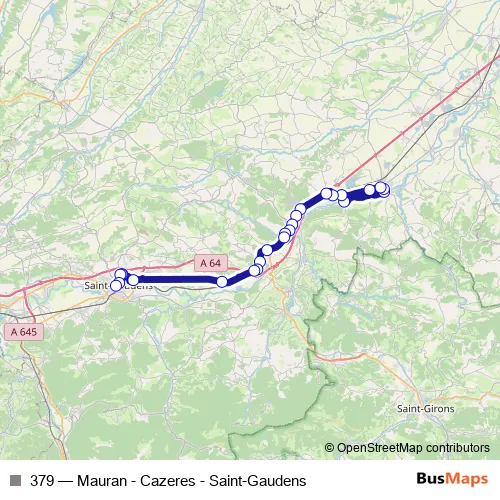 See why over 2 million users trust and consider busmaps.com as the best public transport website. busmaps gives you Saint-Gaudens Buses suggested routes, real-time bus tracker, line route maps in Saint-Gaudens, and helps to find the closest 379 bus stops near you. No internet available? Download an offline PDF map and bus schedule for the 379 bus to take on your trip.