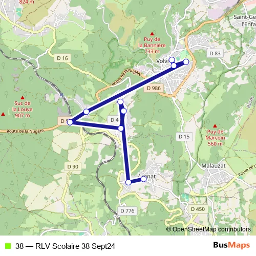 The first stop of the 38 bus route is Eglise d'Argnat and the last stop is Ecole Maternelle. 38 (RLV Scolaire 38 Sept24) is operational during on weekdays.