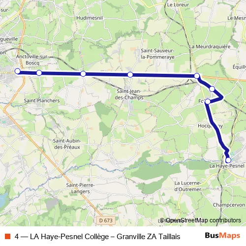 The first stop of the 4 bus route is Collège and the last stop is ZA Taillais. 4 (LA Haye-Pesnel Collège – Granville ZA Taillais) is operational during everyday.
