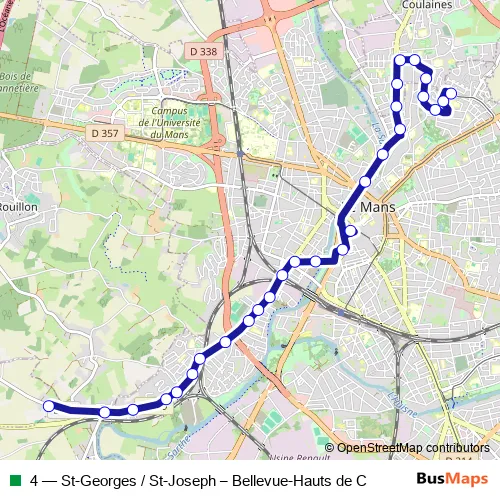 The first stop of the 4 bus route is St-Georges and the last stop is Bellevue - Hauts de Coulaines. 4 (St-Georges / St-Joseph – Bellevue-Hauts de C) is operational during everyday.