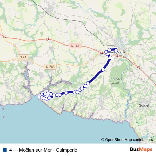 The first stop of the 4 bus route is Blorimond and the last stop is Gare Quai 4. 4 (Moëlan-sur-Mer - Quimperlé) is operational during everyday.