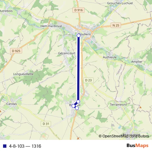 The first stop of the 4-8-103 bus route is Beauval - Phosphate and the last stop is Doullens - Collège Jean Rostand. 4-8-103 (1316) is operational during everyday.