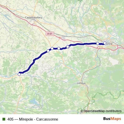 The first stop of the 405 bus route is Carcassonne - Varsovie and the last stop is Mirepoix - Cours Petitpied. 405 (Mirepoix - Carcassonne) is operational during on weekdays.