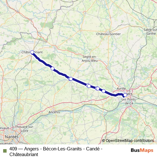 The first stop of the 409 bus route is Gare Routière and the last stop is Gare Routière et Sncf. 409 (Angers - Bécon-Les-Granits - Candé - Châteaubriant) is operational during everyday.