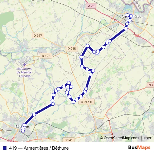The first stop of the 419 bus route is Bethune - Légillon - N°421 and the last stop is Armentieres - Paul Hazard - F N°59. 419 (Armentières / Béthune) is operational during everyday.