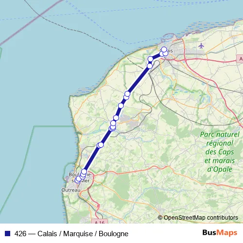 The first stop of the 426 bus route is Boulogne-SUR-MER - Station Liane - Quai18/19 and the last stop is Calais - Gare PEM - Quai L. 426 (Calais / Marquise / Boulogne) is operational during everyday.