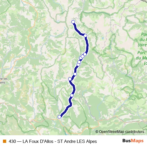 The first stop of the 430 bus route is Gare des Cp and the last stop is La Foux Gare Routiere. 430 (LA Foux D'Allos - ST Andre LES Alpes) is operational during everyday.