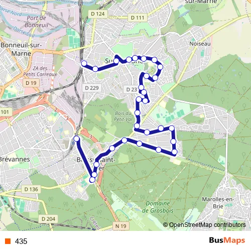 The first stop of the 435 bus route is Gare de Boissy-Saint-Léger and the last stop is Sucy - Bonneuil Rer. 435 is operational during everyday.