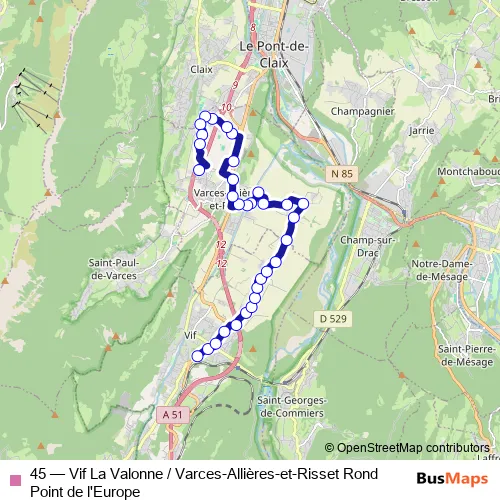 Bus 45 - Vif La Valonne / Varces-Allières-et-Risset Rond Point de l'Europe in Grenoble: Stops & Timetable