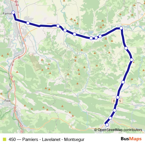 The first stop of the 450 bus route is Lavelanet - Jacquard Pasteur and the last stop is Pamiers - Gare Sncf. 450 (Pamiers - Lavelanet - Montsegur) is operational during everyday.