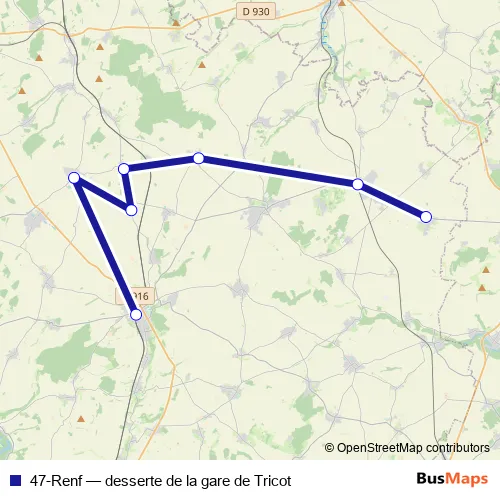 The first stop of the 47-Renf bus route is Gare and the last stop is Gare. 47-Renf (desserte de la gare de Tricot) is operational during everyday.