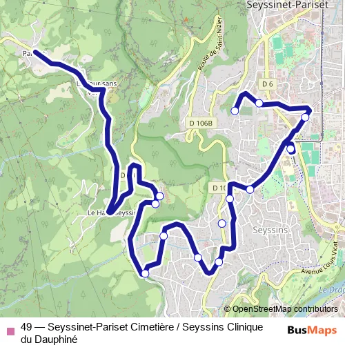 The first stop of the 49 bus route is Seyssins, Clinique du Dauphiné and the last stop is Seyssinet-Pariset, Cimetière. 49 (Seyssinet-Pariset Cimetière / Seyssins Clinique du Dauphiné) is operational during everyday.