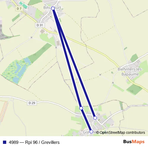 The first stop of the 4989 bus route is Grevillers - Monument - Abri and the last stop is Grevillers - Face Cantine. 4989 (Rpi 96 / Grevillers) is operational during everyday.