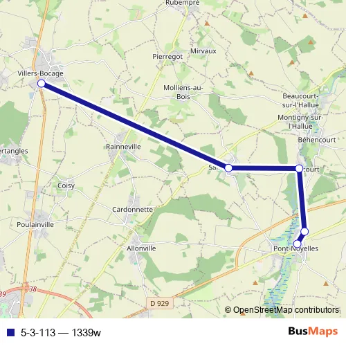 The first stop of the 5-3-113 bus route is Pont-Noyelles - Centre and the last stop is Villers-Bocage - Collège les Coudriers. 5-3-113 (1339w) is operational during everyday.