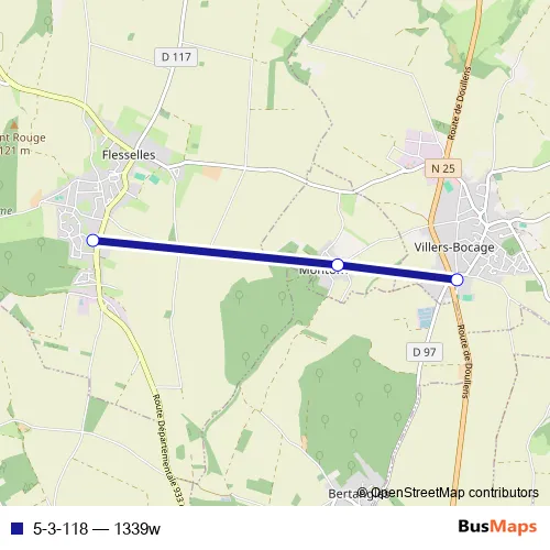 The first stop of the 5-3-118 bus route is Flesselles - Bas Lotissement and the last stop is Villers-Bocage - Collège les Coudriers. 5-3-118 (1339w) is operational during everyday.