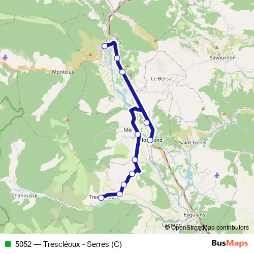 The first stop of the 5052 bus route is Collège/Ecole de Serres and the last stop is Trescléoux - Village. 5052 (Trescléoux - Serres (C)) is operational during on weekdays.