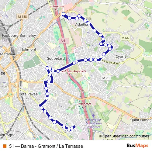 The first stop of the 51 bus route is Balma-Gramont and the last stop is La Terrasse. 51 (Balma - Gramont / La Terrasse) is operational during on weekdays.