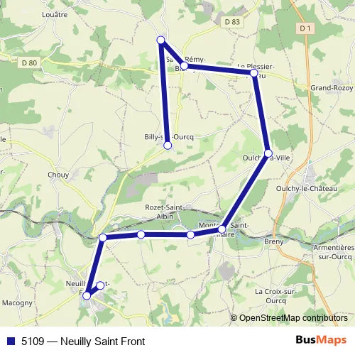 The first stop of the 5109 bus route is Neuilly ST F. - Ces and the last stop is Billy S/ O. - Face Abri. 5109 (Neuilly Saint Front) is operational during on weekdays.