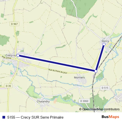 The first stop of the 5155 bus route is Crecy S/ S. - Ecole Primaire and the last stop is Dercy - Place Abri. 5155 (Crecy SUR Serre Primaire) is operational during everyday.