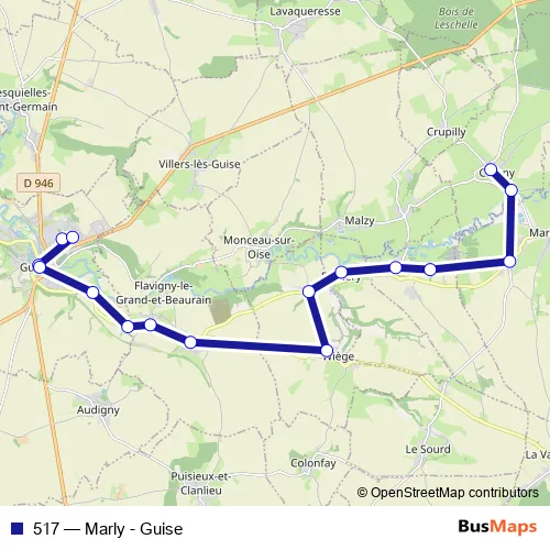 The first stop of the 517 bus route is Guise - Coll. Camille Desmoulins and the last stop is Chigny - Haut Abri. 517 (Marly - Guise) is operational during on weekdays.