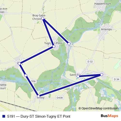 The first stop of the 5191 bus route is Tugny ET P.- Face Abri Pont Tugny and the last stop is ST Simon - Place Abri Eglise. 5191 (Dury-ST Simon-Tugny ET Pont) is operational during everyday.