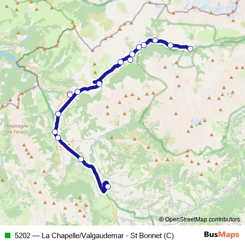 The first stop of the 5202 bus route is Collège Saint Bonnet and the last stop is La Chapelle - Village. 5202 (La Chapelle/Valgaudemar - St Bonnet (C)) is operational during on weekdays.