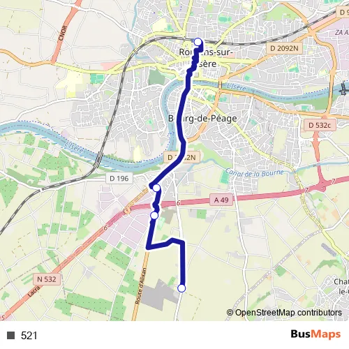 The first stop of the 521 bus route is Romans Gare and the last stop is MFR Mondy. 521 is operational during everyday.