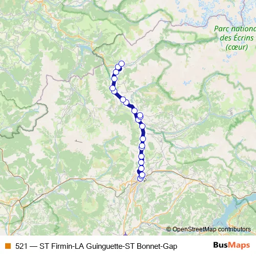 The first stop of the 521 bus route is Collège Saint Bonnet and the last stop is Saint-Firmin - Village. 521 (ST Firmin-LA Guinguette-ST Bonnet-Gap) is operational during on weekdays.