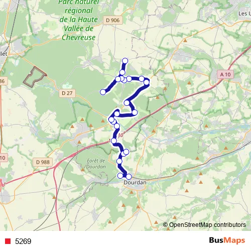 The first stop of the 5269 bus route is Gare de Dourdan and the last stop is Moutiers. 5269 is operational during on weekdays.