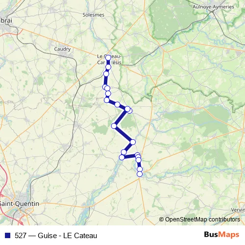 The first stop of the 527 bus route is LE Cateau C. - Gare Routiere and the last stop is Guise - Place Lesur. 527 (Guise - LE Cateau) is operational during everyday.