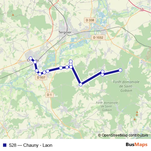 The first stop of the 528 bus route is ST Gobain - Hospital and the last stop is Chauny - Place Bouzier. 528 (Chauny - Laon) is operational during everyday.