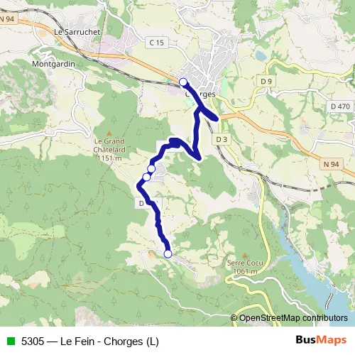The first stop of the 5305 bus route is Allée du Piolit and the last stop is Le Fein. 5305 (Le Fein - Chorges (L)) is operational during on weekdays.