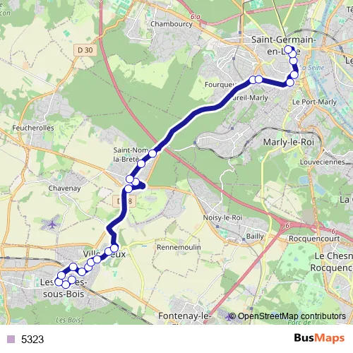 The first stop of the 5323 bus route is Gare Routière des Clayes and the last stop is Gare Saint-Germain-en-Laye - Rue Thiers. 5323 is operational during everyday.