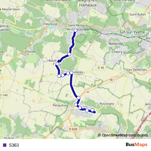 The first stop of the 5363 bus route is Gare de Saint-Rémy-lès-Chevreuse and the last stop is Lycée Jules Verne. 5363 is operational during everyday.
