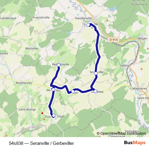 The first stop of the 54s838 bus route is Gerbeviller - College and the last stop is Remenoville - Mairie Ecole. 54s838 (Seranville / Gerbeviller) is operational during on weekdays.