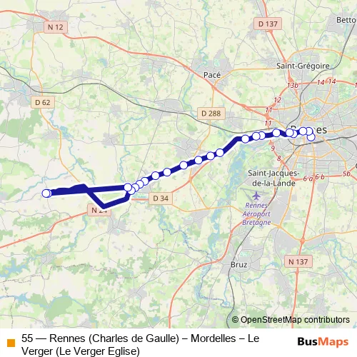 Bus 55 - Rennes (Charles de Gaulle) – Mordelles – Le Verger (Le Verger Eglise) in Rennes: Stops & Timetable